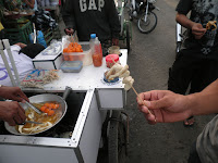 Pork and Chicken Barbecue stalls can be easily found on the roadside. They serve marinated meats on bamboo sticks cooked over an open charcoal grill. You can also find sausages, pig intestines and chicken innards. Quite tasty if you don't mind the dirty surroundings.